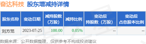 7月26日奋达科技发布公告《奋达科技:对于控股推动过火一致步履东谈主股份变动比例逾越1%的公告》,其推动刘方觉于2023年6月19日至2023年7月25白天整个减捏100.0万股,占公司咫尺总股本的0.0548%,变动期间该股股价下落1.56%金沙娱乐.,抑制7月25日收盘报5.05元。