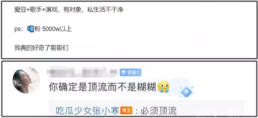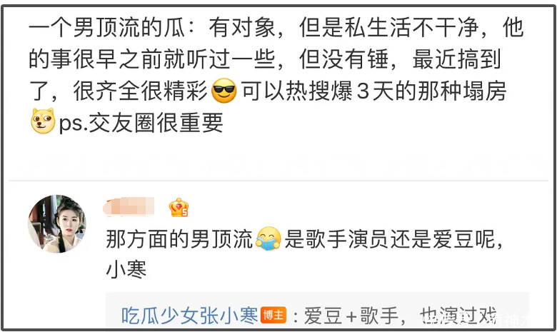 ——狗仔爆料有对象的男顶流私糊口不干净,给出的信息包括爱豆歌手身份、演过戏,微博粉丝5000万以上,还强调必须顶流。