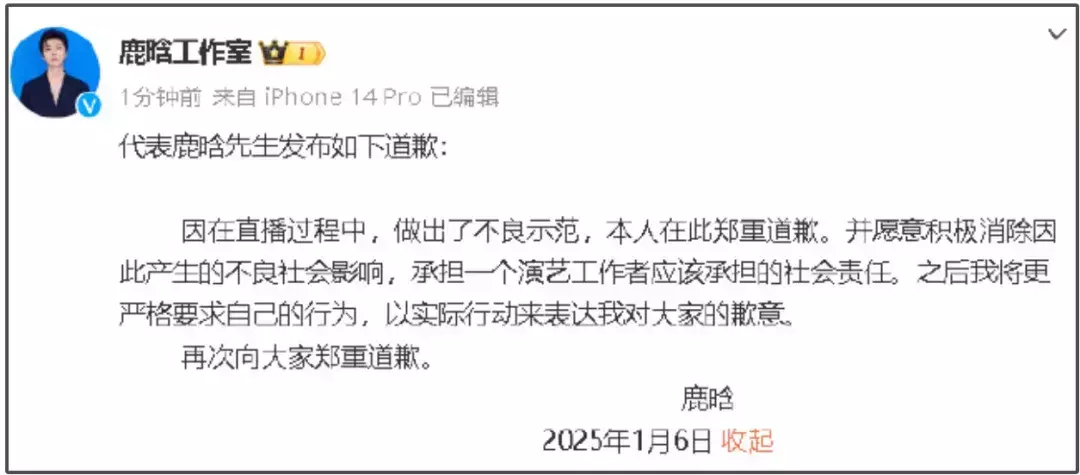现在,鹿晗通过职责室作念出修起,终于为直播导致的一系列风云说念了歉,暗示我方在直播经过中作念出了不良示范,之后会更严格条目我方的活动,以本体活动来抒发歉意。