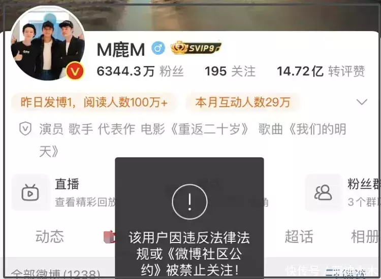 ——网友发现,鹿晗三大平台账号全部被辞谢吝惜,其中两大平台王人提到鹿晗违抗了平台契约,其中一个微博平台最为具体,强调了一句“该用户因违抗法律步骤或《微博社区契约》被辞谢吝惜”。